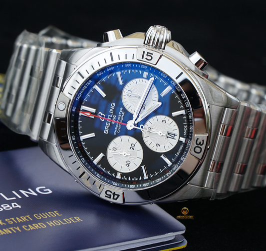 Breitling Top Time AB01763A1C1X1 (Thunderball), anno 2025, nuovo, automatico calibro B01 con 70 h di riserva di carica. Cassa in acciaio 41 mm, vetro zaffiro, impermeabile 10 ATM. Quadrante blu, cinturino in pelle marrone con chiusura déployante. Completo di scatola e documenti originali. Disponibile su ordinazione. I clienti extra UE possono acquistare senza IVA al 22%.