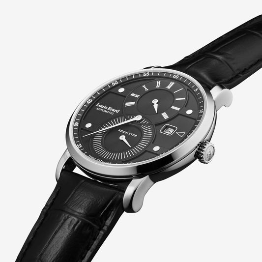 Orologio da uomo con cassa tonda in acciaio inox da 42 mm e quadrante nero. Movimento automatico con indicazione ore, minuti, secondi, data e funzione regolatore. Vetro zaffiro e fondello in acciaio inciso.