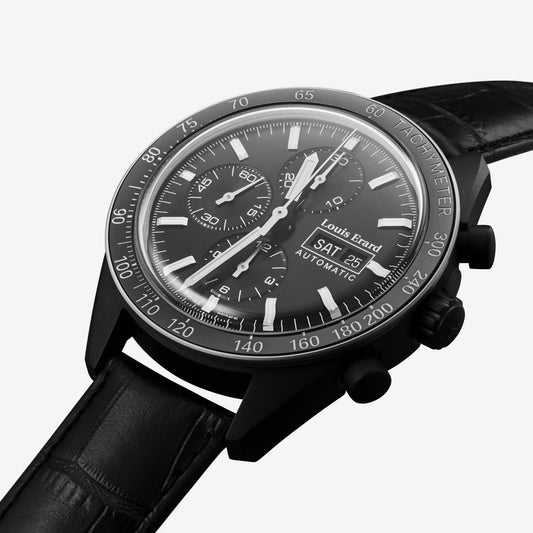 Orologio da uomo con cassa tonda in acciaio inox con rivestimento PVD nero, diametro 42 mm e quadrante nero. Movimento automatico con funzioni ore, minuti, piccoli secondi, data e cronografo. Vetro zaffiro e fondello in acciaio con oblò trasparente.