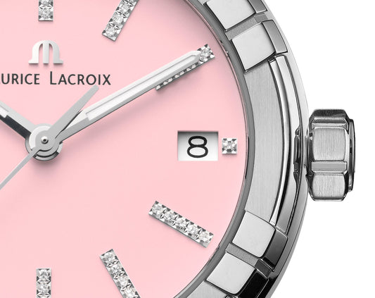 Maurice Lacroix Aikon,ref. AI6006-SS00F-550-E , automatico, 35 mm, cassa in acciaio, lunetta in acciaio, vetro zaffiro, quadrante rosa, data, impermeabilità 20 ATM, bracciale in acciaio, secondo bracciale aggiuntivo incluso, chiusura deployante in acciaio, anno 2025, nuovo, completo di scatola e documenti originali, articolo da ordinare