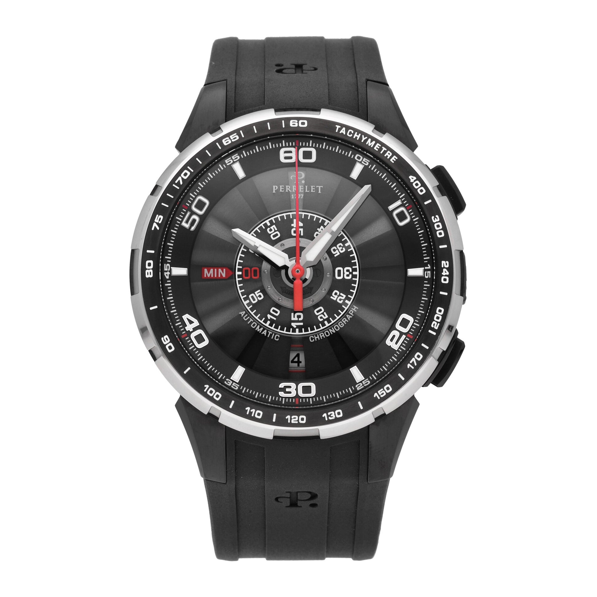 Forma cassa: rotonda Dimensioni cassa: 47 mm Spessore cassa: 16,3 mm Materiale cassa: acciaio inox Colore cassa: nero Lunetta: fissa Quadrante: nero Vetro: zaffiro antigraffio Fondello: a vista Impermeabilità: — (non indicata) Materiale cinturino: gomma Colore cinturino: nero Chiusura: ardiglione Movimento: automatico Funzioni: cronografo Paese di produzione: Svizzera Genere: uomo Stile: casual, classico, subacqueo, lusso, sportivo Marca: Perrelet Modello: Turbine Chronograph Garanzia venditore: sì Scatola originale: sì Documenti originali: sì Libretto/manuale: sì